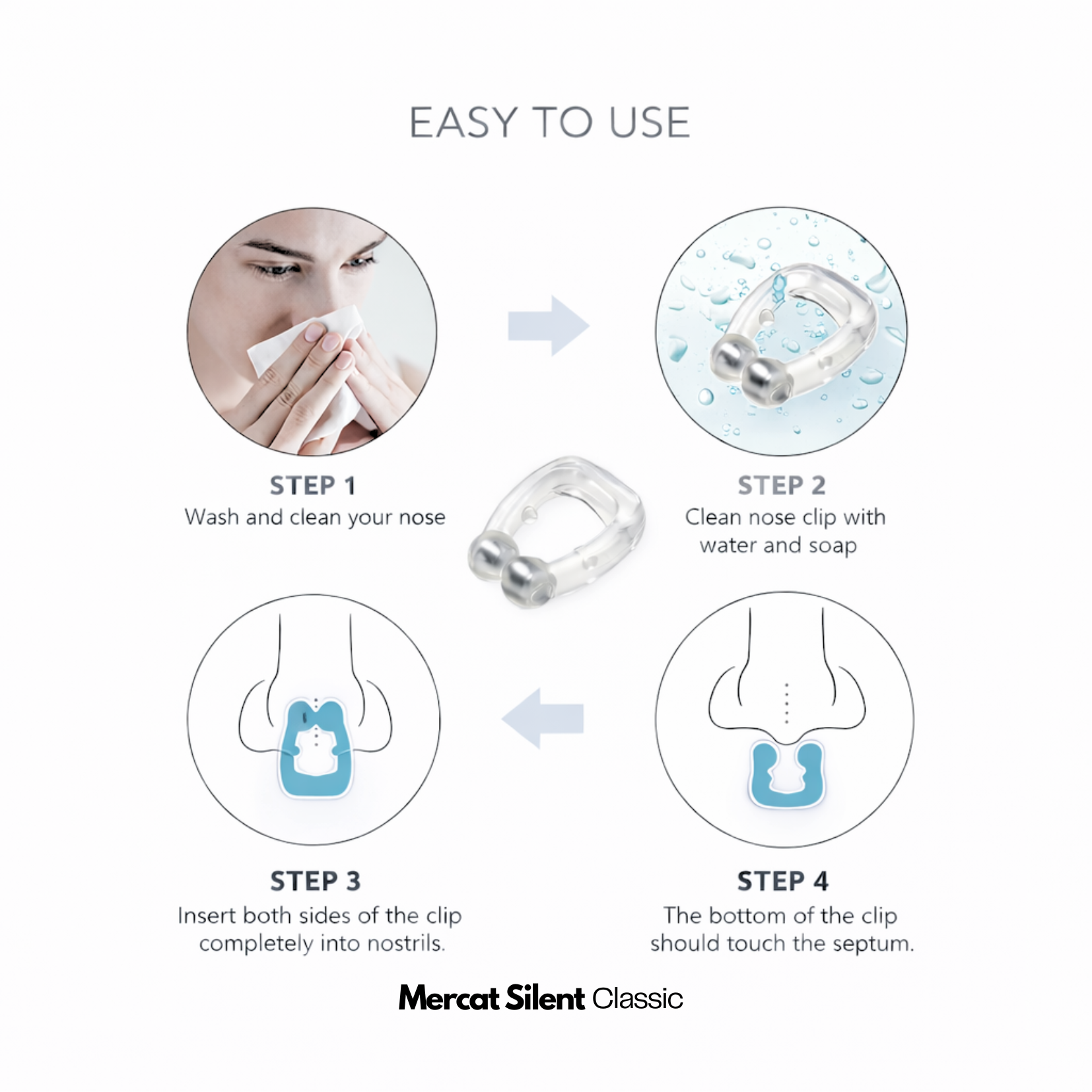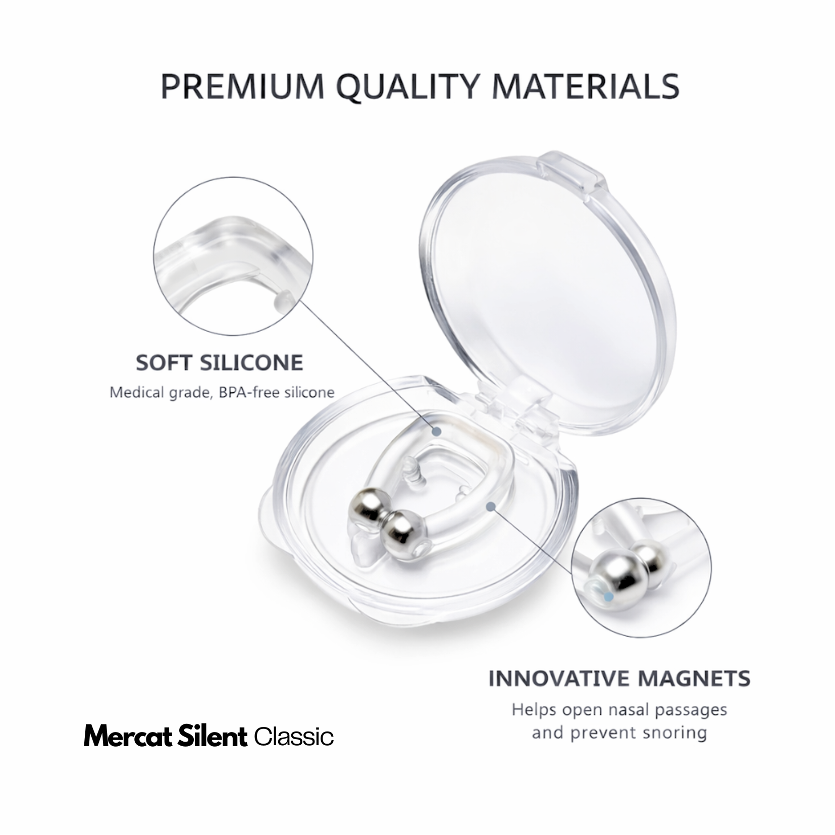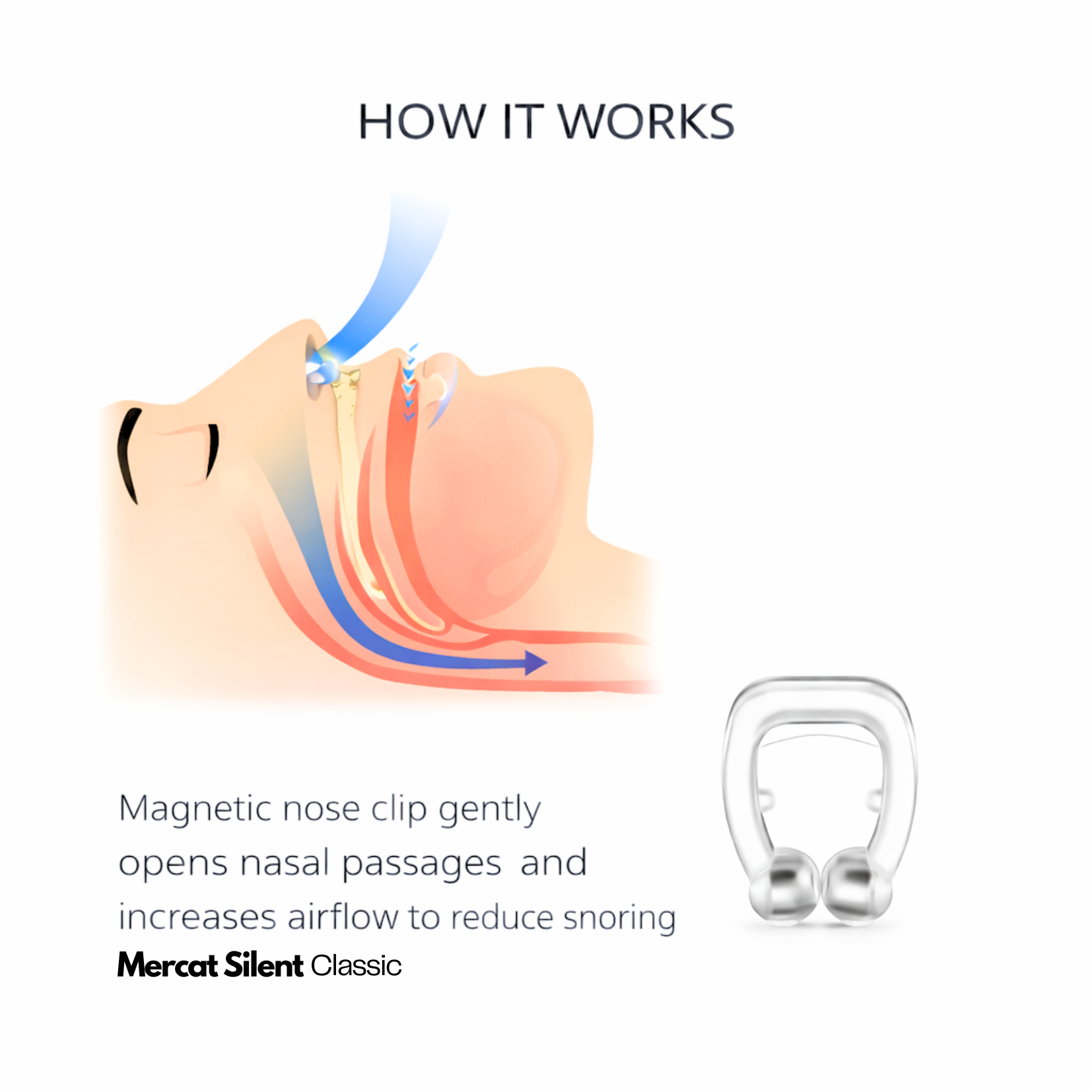 Mercat Silent - Classic is designed to gently support and open the nasal passages during sleep. By improving airflow through the nose, it may help reduce snoring caused by nasal congestion or narrow airways.